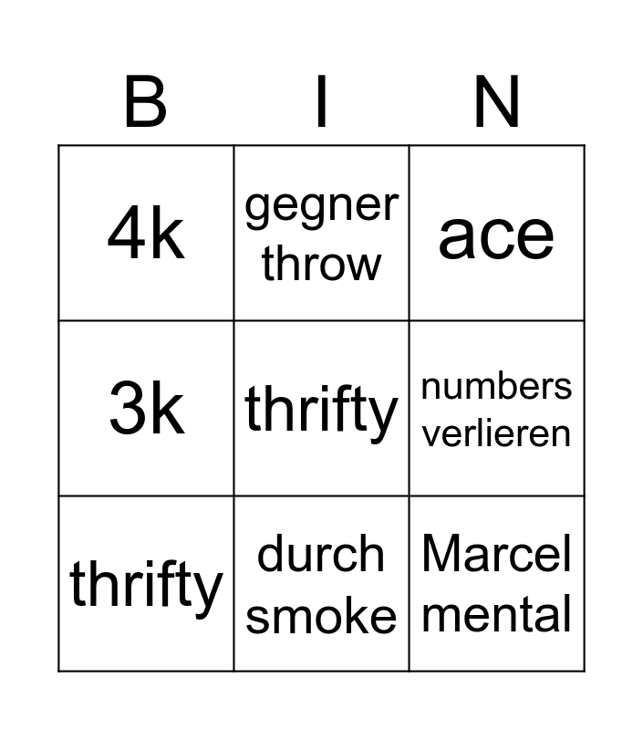 This bingo card has a free space and 12 words: horaisn Mental, Mate throw, Marcel mental, numbers verlieren, gegner throw, ace, durch smoke, knife, 4k, 3k, thrifty and odin wallbang.