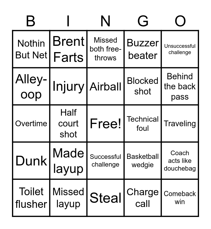 This bingo card has a free space and 24 words: Made layup, Missed layup, Airball, Toilet flusher, Unsuccessful challenge, Nothin But Net, Alley-oop, Brent Farts, Technical foul, Successful challenge, Blocked shot, Overtime, Basketball wedgie, Coach acts like douchebag, Injury, Charge call, Traveling, Missed both free-throws, Behind the back pass, Half court shot, Comeback win, Dunk, Buzzer beater and Steal.