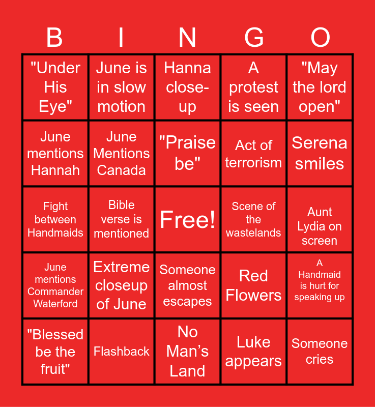 This bingo card has a free space and 24 words: Extreme closeup of June, Flashback, "Praise be", "Blessed be the fruit", "May the lord open", "Under His Eye", June mentions Hannah, June is in slow motion, Scene of the wastelands, Someone almost escapes, Act of terrorism, Fight between Handmaids, Red Flowers, A Handmaid is hurt for speaking up, June Mentions Canada, Luke appears, Aunt Lydia on screen, Hanna close-up, Serena smiles, Bible verse is mentioned, Someone cries, June mentions Commander Waterford, A protest is seen and No Man’s Land.