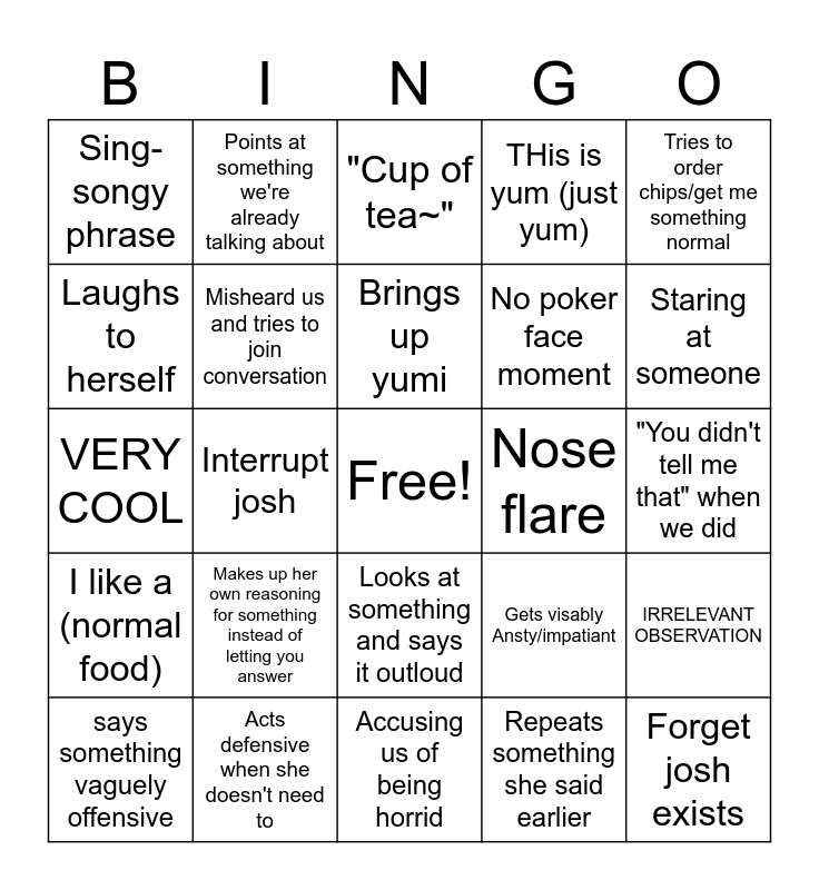 This bingo card has a free space and 26 words: Looks at something and says it outloud, Repeats something she said earlier, Brings up yumi, Acts defensive when she doesn't need to, Tries to order chips/get me something normal, Sing-songy phrase, Laughs to herself, Points at something we're already talking about, "You didn't tell me that" when we did, Gets visably Ansty/impatiant, No poker face moment, VERY COOL, IRRELEVANT OBSERVATION, says something vaguely offensive, Interrupt josh, Saying things without context, THis is yum (just yum), I like a (normal food), "Cup of tea~", Forget josh exists, Staring at someone, Accusing us of being horrid, Nose flare, Makes up her own reasoning for something instead of letting you answer, Misheard us and tries to join conversation and Doesn't understand when something is a joke.