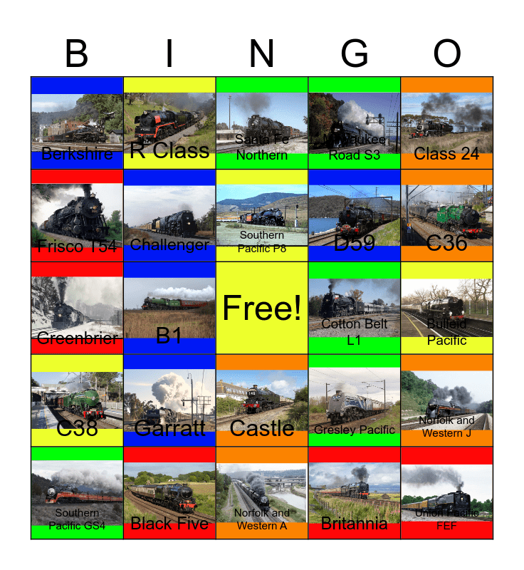 This bingo card has 24 images, a free space and 24 words: Garratt, Black Five, Southern Pacific P8, Southern Pacific GS4, Class 24, Berkshire, Frisco T54, R Class, Cotton Belt L1, Castle, D59, Greenbrier, Gresley Pacific, Norfolk and Western J, Challenger, Britannia, Bulleid Pacific, Santa Fe Northern, C36, B1, Union Pacific FEF, C38, Milwaukee Road S3 and Norfolk and Western A.
