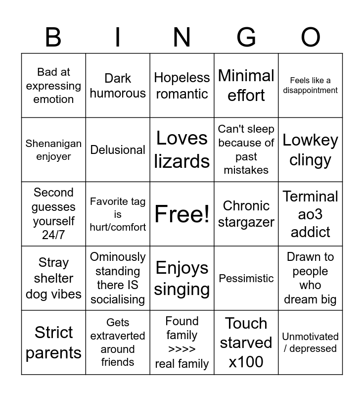 This bingo card has a free space and 24 words: Ominously standing there IS socialising, Gets extraverted around friends, Loves lizards, Strict parents, Feels like a disappointment, Bad at expressing emotion, Shenanigan enjoyer, Dark humorous, Chronic stargazer, Enjoys singing, Can't sleep because of past mistakes, Second guesses yourself 24/7, Pessimistic, Drawn to people who dream big, Delusional, Touch starved x100, Terminal ao3 addict, Hopeless romantic, Lowkey clingy, Favorite tag is hurt/comfort, Unmotivated / depressed, Stray shelter dog vibes, Minimal effort and Found family >>>> real family.