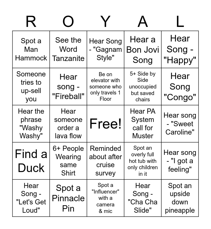 This bingo card has a free space and 24 words: 6+ People Wearing same Shirt, Spot a Pinnacle Pin, Be on elevator with someone who only travels 1 Floor, Hear Song - "Let's Get Loud", Hear Song - "Happy", Spot a Man Hammock, Someone tries to up-sell you, See the Word Tanzanite, Hear PA System call for Muster, Reminded about after cruise survey, 5+ Side by Side unoccupied but saved chairs, Hear the phrase "Washy Washy", Spot an overly full hot tub with only children in it, Hear song - "I got a feeling", Hear song - "Fireball", Hear Song - "Cha Cha Slide", Hear song - "Sweet Caroline", Hear Song - "Gagnam Style", Hear Song "Congo", Hear someone order a lava flow, Spot an upside down pineapple, Find a Duck, Hear a Bon Jovi Song and Spot a "Influencer" with a camera & mic.