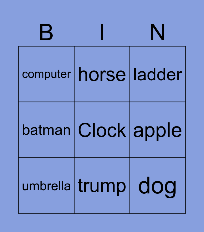 This bingo card has a free space and 8 words: apple, ladder, horse, umbrella, computer, dog, batman and trump.