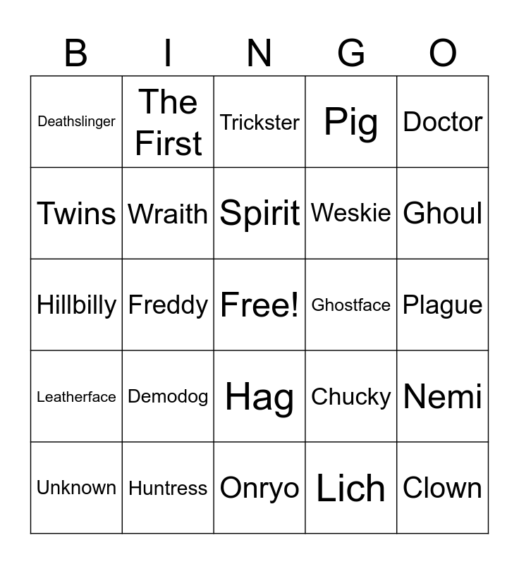 This bingo card has a free space and 41 words: Trapper, Hillbilly, Nurse, Wraith, Huntress, Hag, Spirit, Myers, Doctor, Leatherface, Freddy, Pig, Clown, Plague, Ghostface, Demodog, Oni, Deathslinger, PyramidHead, Trickster, Nemi, Pinhead, Onryo, Weskie, Knight, Alien, Lich, Dracula, Ghoul, Springtrap, Krasue, The First, Unknown, Houndmaster, Chucky, Twins, Skull merchant, Dredge, Artist, Singularity and Blight.