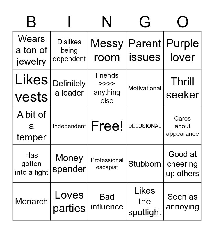 This bingo card has a free space and 24 words: Money spender, Loves parties, Friends >>>> anything else, Monarch, Purple lover, Wears a ton of jewelry, Likes vests, Dislikes being dependent, DELUSIONAL, Professional escapist, Motivational, A bit of a temper, Stubborn, Good at cheering up others, Definitely a leader, Likes the spotlight, Cares about appearance, Messy room, Thrill seeker, Independent, Seen as annoying, Has gotten into a fight, Parent issues and Bad influence.