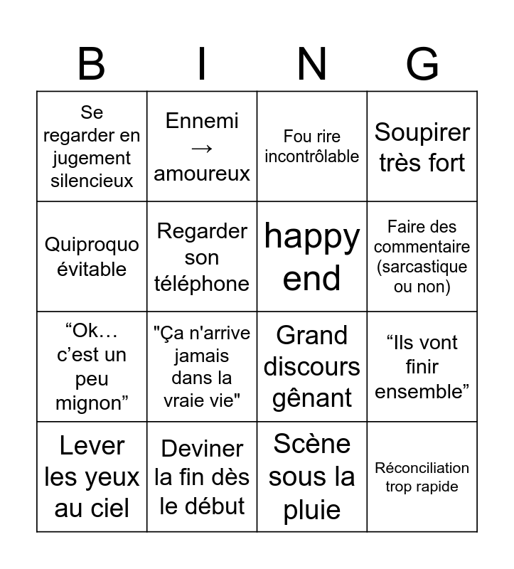 This bingo card has 16 words: Deviner la fin dès le début, “Ils vont finir ensemble”, Fou rire incontrôlable, Se regarder en jugement silencieux, “Ok… c’est un peu mignon”, Ennemi → amoureux, Grand discours gênant, Scène sous la pluie, Quiproquo évitable, Regarder son téléphone, Lever les yeux au ciel, Soupirer très fort, "Ça n'arrive jamais dans la vraie vie", Faire des commentaire (sarcastique ou non), happy end and Réconciliation trop rapide.
