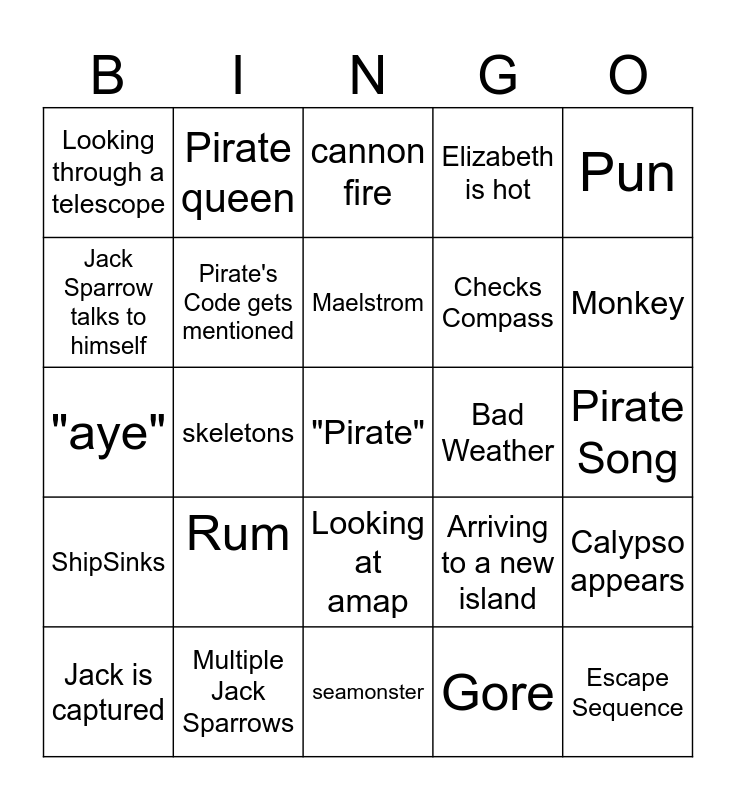 This bingo card has a free space and 29 words: Jack is captured, Sword Fight, skeletons, "Treasure", Looking through a telescope, cannon fire, Pirate's Code gets mentioned, Rum, Bad Weather, Multiple Jack Sparrows, Pirate Song, Escape Sequence, seamonster, Gore, Monkey, Mention of Davy Jones/Davy Jones'Locker, Looking at amap, ShipSinks, Pun, "aye", Arriving to a new island, drivin da boat, Checks Compass, Jack Sparrow talks to himself, Elizabeth is hot, Pirate queen, Calypso appears, Maelstrom and Shenanigans.