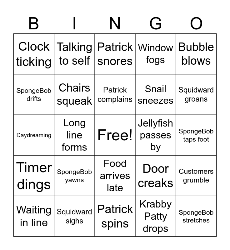 This bingo card has a free space and 24 words: SpongeBob yawns, Squidward sighs, Patrick complains, Waiting in line, Bubble blows, Clock ticking, SpongeBob drifts, Talking to self, Jellyfish passes by, Food arrives late, Snail sneezes, Daydreaming, Door creaks, Customers grumble, Chairs squeak, Krabby Patty drops, SpongeBob taps foot, Patrick snores, Squidward groans, Long line forms, SpongeBob stretches, Timer dings, Window fogs and Patrick spins.