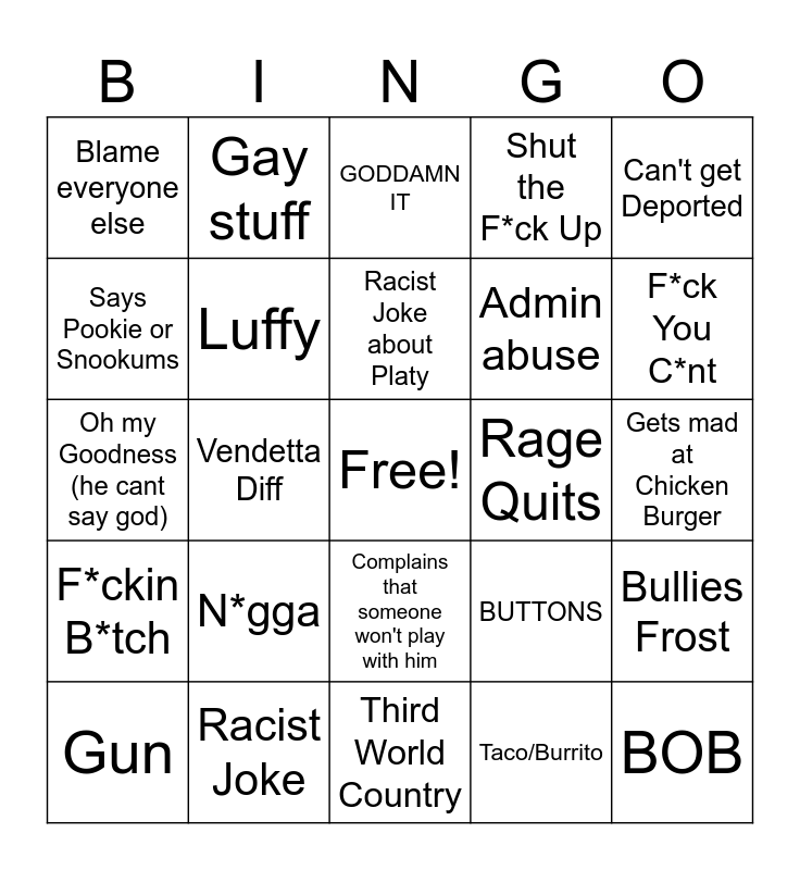 This bingo card has a free space and 24 words: N*gga, Racist Joke, Racist Joke about Platy, Gun, Can't get Deported, Blame everyone else, Says Pookie or Snookums, Gay stuff, Rage Quits, Complains that someone won't play with him, Admin abuse, Oh my Goodness (he cant say god), BUTTONS, Bullies Frost, Luffy, Taco/Burrito, Gets mad at Chicken Burger, GODDAMN IT, F*ck You C*nt, Vendetta Diff, BOB, F*ckin B*tch, Shut the F*ck Up and Third World Country.