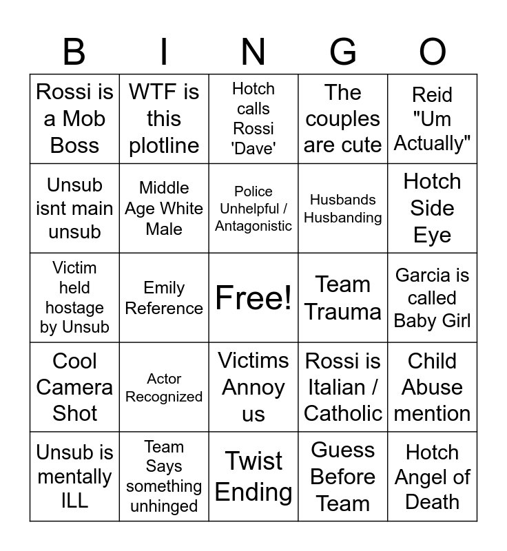 This bingo card has a free space and 29 words: Unsub is mentally ILL, Past Episode Reference, Emily Reference, Morgan tackles Unsub, Rossi is a Mob Boss, Hotch calls Rossi 'Dave', Middle Age White Male, Actor Recognized, Team Trauma, Team Says something unhinged, Garcia is called Baby Girl, Hotch Angel of Death, Twist Ending, Guess Before Team, Hotch Side Eye, Gang needs a hint, Victims Annoy us, Cool Camera Shot, Reid "Um Actually", Victim held hostage by Unsub, Rossi is Italian / Catholic, Fathers / Kids moment, Husbands Husbanding, Unsub isnt main unsub, The couples are cute, WTF is this plotline, Child Abuse mention, Police Unhelpful / Antagonistic and Wanna steal an outfit.