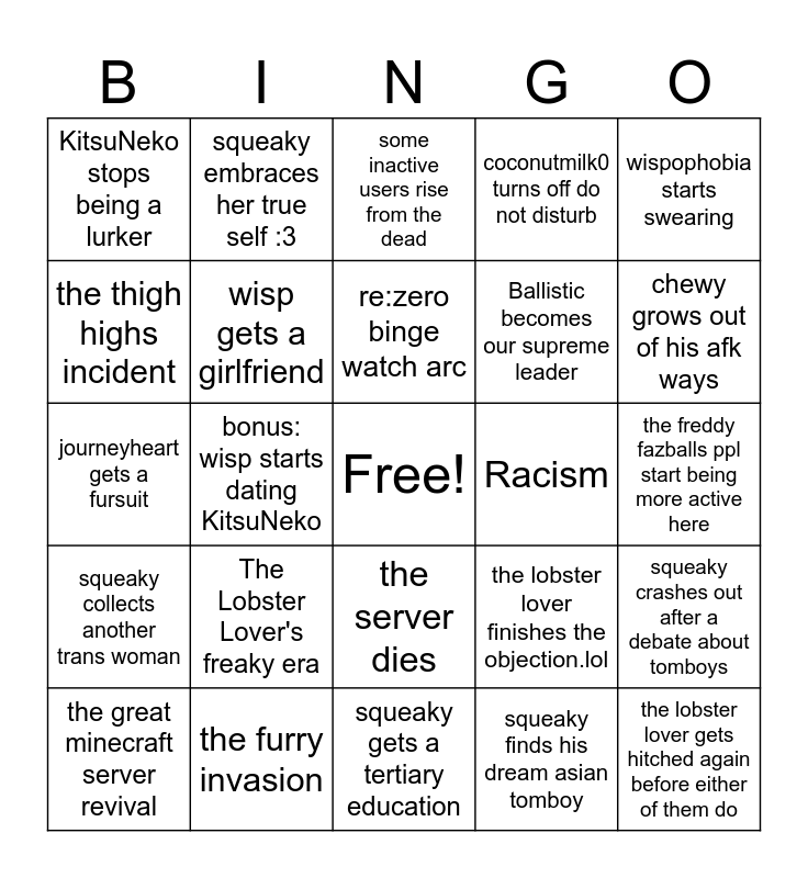 This bingo card has a free space and 24 words: The Lobster Lover's freaky era, the furry invasion, re:zero binge watch arc, the great minecraft server revival, wispophobia starts swearing, KitsuNeko stops being a lurker, the thigh highs incident, squeaky embraces her true self :3, Racism, the server dies, Ballistic becomes our supreme leader, journeyheart gets a fursuit, the lobster lover finishes the objection.lol, squeaky crashes out after a debate about tomboys, wisp gets a girlfriend, squeaky finds his dream asian tomboy, the freddy fazballs ppl start being more active here, some inactive users rise from the dead, chewy grows out of his afk ways, bonus: wisp starts dating KitsuNeko, the lobster lover gets hitched again before either of them do, squeaky collects another trans woman, coconutmilk0 turns off do not disturb and squeaky gets a tertiary education.