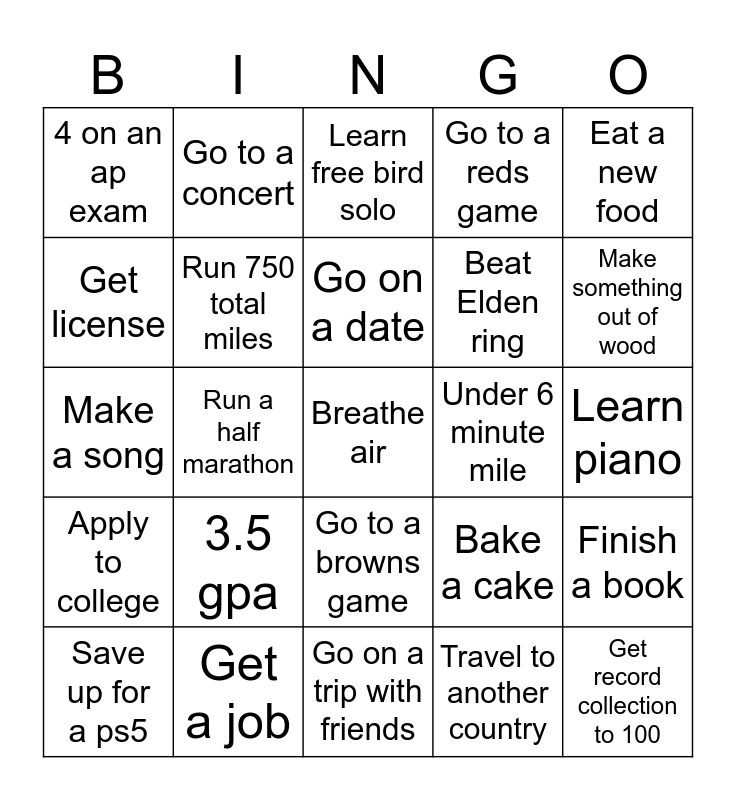 This bingo card has a free space and 24 words: 3.5 gpa, Get a job, Go on a date, Save up for a ps5, Eat a new food, 4 on an ap exam, Get license, Go to a concert, Under 6 minute mile, Go to a browns game, Beat Elden ring, Make a song, Bake a cake, Finish a book, Run 750 total miles, Travel to another country, Learn piano, Learn free bird solo, Make something out of wood, Run a half marathon, Get record collection to 100, Apply to college, Go to a reds game and Go on a trip with friends.