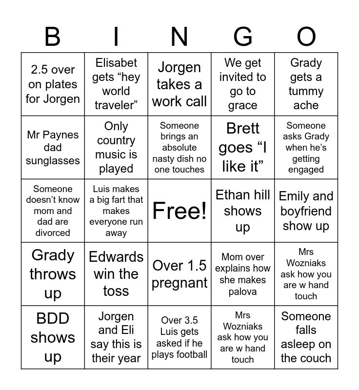 This bingo card has a free space and 24 words: Edwards win the toss, Jorgen and Eli say this is their year, Someone brings an absolute nasty dish no one touches, BDD shows up, Grady gets a tummy ache, 2.5 over on plates for Jorgen, Mr Paynes dad sunglasses, Elisabet gets “hey world traveler”, Ethan hill shows up, Over 1.5 pregnant, Brett goes “I like it”, Someone doesn’t know mom and dad are divorced, Mom over explains how she makes palova, Mrs Wozniaks ask how you are w hand touch, Only country music is played, Mrs Wozniaks ask how you are w hand touch, Emily and boyfriend show up, Jorgen takes a work call, Someone asks Grady when he’s getting engaged, Luis makes a big fart that makes everyone run away, Someone falls asleep on the couch, Grady throws up, We get invited to go to grace and Over 3.5 Luis gets asked if he plays football.