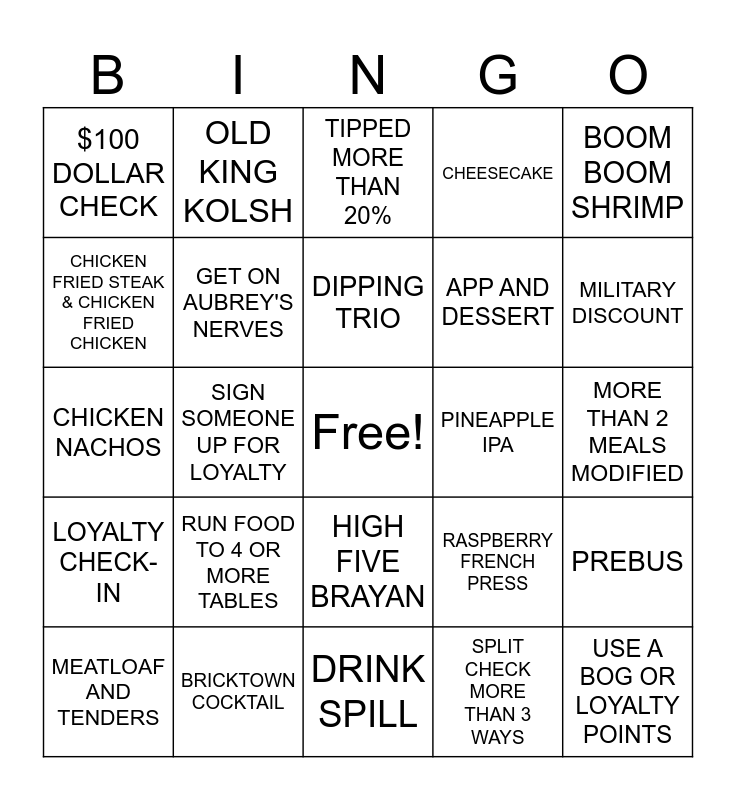 This bingo card has a free space and 24 words: RUN FOOD TO 4 OR MORE TABLES, BRICKTOWN COCKTAIL, DIPPING TRIO, MEATLOAF AND TENDERS, BOOM BOOM SHRIMP, $100 DOLLAR CHECK, CHICKEN FRIED STEAK & CHICKEN FRIED CHICKEN, OLD KING KOLSH, PINEAPPLE IPA, HIGH FIVE BRAYAN, APP AND DESSERT, CHICKEN NACHOS, RASPBERRY FRENCH PRESS, PREBUS, GET ON AUBREY'S NERVES, SPLIT CHECK MORE THAN 3 WAYS, MORE THAN 2 MEALS MODIFIED, TIPPED MORE THAN 20%, MILITARY DISCOUNT, SIGN SOMEONE UP FOR LOYALTY, USE A BOG OR LOYALTY POINTS, LOYALTY CHECK-IN, CHEESECAKE and DRINK SPILL.