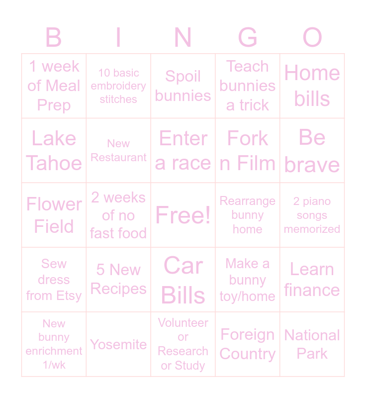 This bingo card has a free space and 24 words: 5 New Recipes, Yosemite, Enter a race, New bunny enrichment 1/wk, Home bills, 1 week of Meal Prep, Lake Tahoe, 10 basic embroidery stitches, Rearrange bunny home, Car Bills, Fork n Film, Flower Field, Make a bunny toy/home, Learn finance, New Restaurant, Foreign Country, 2 piano songs memorized, Spoil bunnies, Be brave, 2 weeks of no fast food, National Park, Sew dress from Etsy, Teach bunnies a trick and Volunteer or Research or Study.