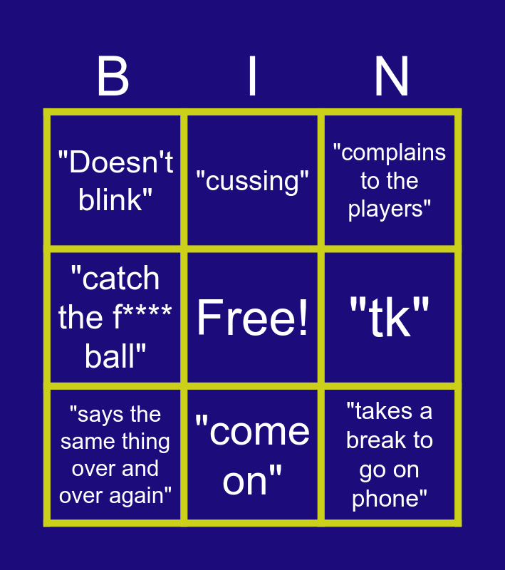 This bingo card has a free space and 8 words: "tk", "complains to the players", "cussing", "says the same thing over and over again", "Doesn't blink", "takes a break to go on phone", "catch the f**** ball" and "come on".