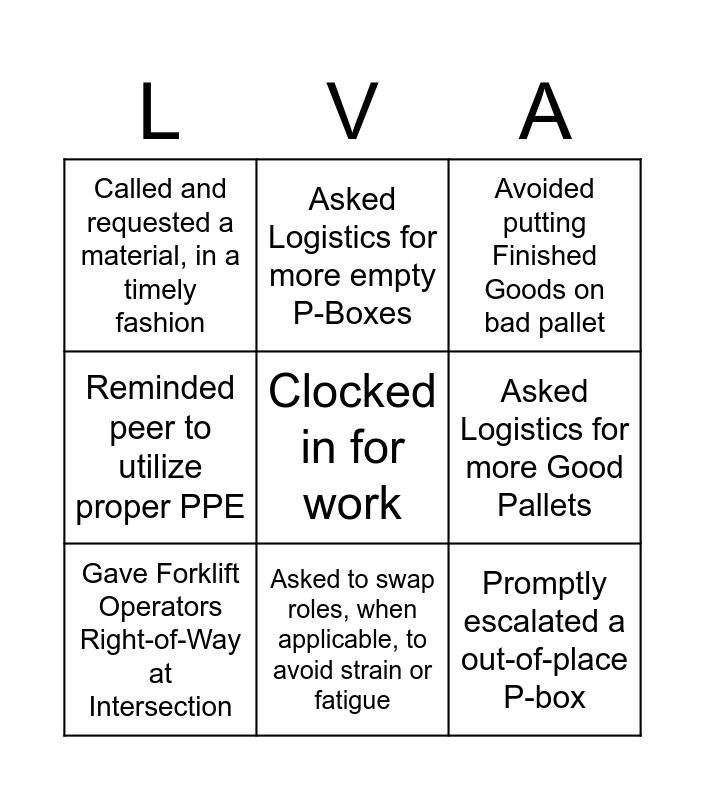 This bingo card has a free space and 8 words: Asked Logistics for more Good Pallets, Avoided putting Finished Goods on bad pallet, Asked Logistics for more empty P-Boxes, Gave Forklift Operators Right-of-Way at Intersection, Called and requested a material, in a timely fashion, Promptly escalated a out-of-place P-box, Reminded peer to utilize proper PPE and Asked to swap roles, when applicable, to avoid strain or fatigue.