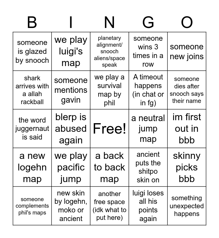 This bingo card has a free space and 24 words: we play pacific jump, new skin by logehn, moko or ancient, we play a survival map by phil, someone complements phil's maps, someone new joins, someone is glazed by snooch, shark arrives with a allah rackball, we play luigi's map, a neutral jump map, a back to back map, A timeout happens (in chat or in fg), the word juggernaut is said, ancient puts the shitpo skin on, skinny picks bbb, someone mentions gavin, luigi loses all his points again, im first out in bbb, planetary alignment/ snooch aliens/space speak, someone dies after snooch says their name, blerp is abused again, something unexpected happens, a new logehn map, someone wins 3 times in a row and another free space (idk what to put here).