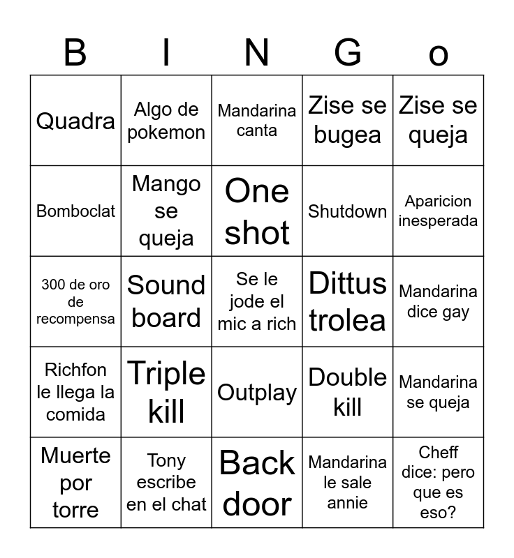 This bingo card has 25 words: Triple kill, Back door, One shot, Muerte por torre, Zise se queja, Quadra, Bomboclat, Algo de pokemon, Dittus trolea, Outplay, Shutdown, 300 de oro de recompensa, Double kill, Mandarina se queja, Mango se queja, Cheff dice: pero que es eso?, Mandarina dice gay, Mandarina canta, Aparicion inesperada, Sound board, Se le jode el mic a rich, Tony escribe en el chat, Richfon le llega la comida, Zise se bugea and Mandarina le sale annie.