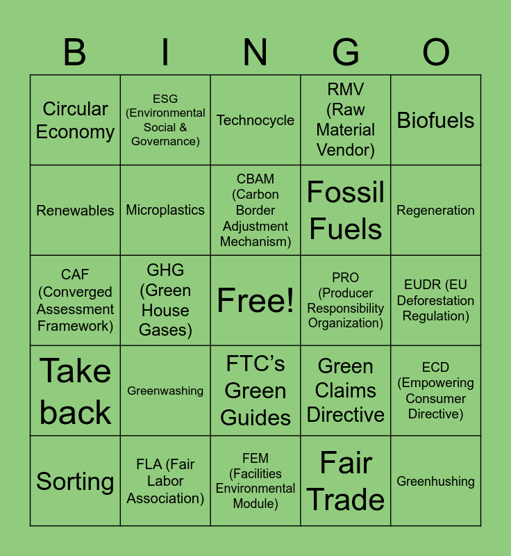 This bingo card has a free space and 89 words: Advocacy, Collaboration, FTC’s Green Guides, chasing arrows, Proposition 65, FIFRA (Federal Insecticide, Fungicide, and Rodenticide Act), European Green Deal, CSRD (Corporate Sustainability Reporting Directive), CSDDD (Corporate Sustainability Due Diligence Directive), ESPR (Ecodesign for Sustainable Products Regulation), DPP (Digital Product Passports), EPR (Extended Producer Responsibility), ECD (Empowering Consumer Directive), EUDR (EU Deforestation Regulation), PPWR (Packaging and Packaging Waste Regulation), CBAM (Carbon Border Adjustment Mechanism), UPI (Unique Product Identifier), SMEs (Small and Medium Enterprises), OHS (Occupational Health and Safety), UFLPA (Uyghur Forced Labor Prevention Act), SLCP (Social & Labor Convergence Program), Higg Index, FEM (Facilities Environmental Module), FSLM (Facilities Social & Labor Module), CAF (Converged Assessment Framework), FLA (Fair Labor Association), BSCI (Business Social Compliance Initiative), LIA (Leather Impact Accelerator), LWG (Leather Working Group), BCI (Better Cotton Initiative), RMV (Raw Material Vendor), GHG (Green House Gases), ILO (International Labor Organization), Circular Economy, Biocycle, Technocycle, Renewables, Feedstock, Regeneration, Sorting, Take back, FLR (Forced Labor Regulation), WFD (Waste Framework Directive), Eco Modulation, Green Claims Directive, PRO (Producer Responsibility Organization), Traceability, End of Life, Transparency, ESG (Environmental Social & Governance), BCT (Box Compression Test), Tier 1 (T1), Tier 2 (T2), Tier 3 (T3), Tier 4 (T4), Audit Fatigue, ISO 14001, MSI (Multi Stakeholder Initiative), NGO (Non-Governmental Organization), SBTi (Science Based Targets initiative), Emissions, PEF (Product Environmental Footprint), Migrant Workers, MSA (Modern Slavery Act), Forced Labor, Social Equity, Stakeholder, PFAS (Per- and Polyfluoroalkyl Substances), PFOA (Perfluorooctanoic Acid), Greenwashing, Greenhushing, Upcycle, Zero Waste, Fossil Fuels, Microplastics, Fair Trade, Human Rights, MRSL (Manufacturer's Restricted Substance List), RSL (Restricted Substance List), Electrification, Biofuels, Carbon Offsets, Carbon Insets, Social Equity, Social Justice, CO2, Responsible Sourcing, Debt Bondage and CDP (Carbon Disclosure Project).