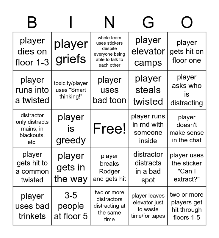 This bingo card has a free space and 25 words: player gets in the way, two or more distractors distracting at the same time, player uses bad toon, player uses bad trinkets, player gets hit on floor one, player dies on floor 1-3, player runs into a twisted, player griefs, player runs in rnd with someone inside, player breaks Rodger and gets hit, player steals twisted, distractor only distracts mains, in blackouts, etc., distractor distracts in a bad spot, player uses the sticker "Can I extract?", toxicity/player uses "Smart thinking!", player uses crazy ahh fonts in the chat, player doesn't make sense in the chat, whole team uses stickers despite everyone being able to talk to each other, player asks who is distracting, player is greedy, two or more players get hit through floors 1-5, 3-5 people at floor 5, player gets hit to a common twisted, player elevator camps and player leaves elevator just to waste time/for tapes.