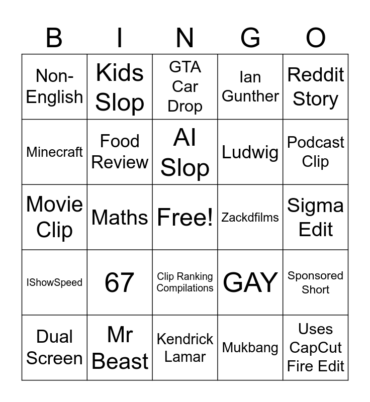 This bingo card has a free space and 24 words: 67, Mr Beast, AI Slop, Dual Screen, Reddit Story, Non-English, Minecraft, Kids Slop, Zackdfilms, Clip Ranking Compilations, Ludwig, Movie Clip, GAY, Sponsored Short, Food Review, Mukbang, Sigma Edit, GTA Car Drop, Podcast Clip, Maths, Uses CapCut Fire Edit, IShowSpeed, Ian Gunther and Kendrick Lamar.
