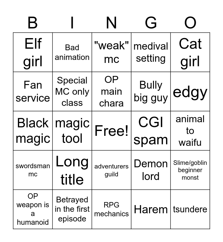 This bingo card has a free space and 24 words: Long title, Betrayed in the first episode, OP main chara, OP weapon is a humanoid, Cat girl, Elf girl, Fan service, Bad animation, CGI spam, adventurers guild, Bully big guy, Black magic, Demon lord, Slime/goblin beginner monst, Special MC only class, Harem, animal to waifu, "weak" mc, edgy, magic tool, tsundere, swordsman mc, medival setting and RPG mechanics.