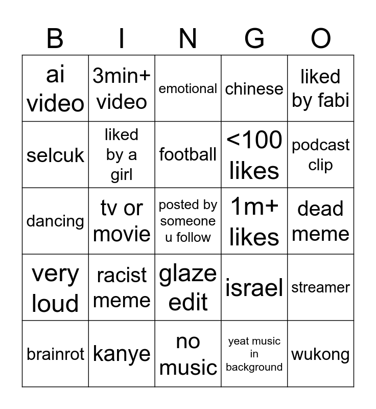 This bingo card has a free space and 24 words: racist meme, kanye, football, brainrot, liked by fabi, ai video, selcuk, 3min+ video, 1m+ likes, glaze edit, <100 likes, dancing, israel, streamer, liked by a girl, yeat music in background, dead meme, emotional, podcast clip, tv or movie, wukong, very loud, chinese and no music.