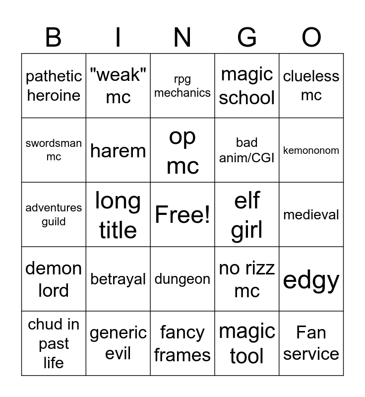 This bingo card has a free space and 24 words: betrayal, generic evil, op mc, chud in past life, clueless mc, pathetic heroine, swordsman mc, "weak" mc, elf girl, dungeon, bad anim/CGI, adventures guild, no rizz mc, edgy, harem, magic tool, medieval, rpg mechanics, kemononom, long title, Fan service, demon lord, magic school and fancy frames.