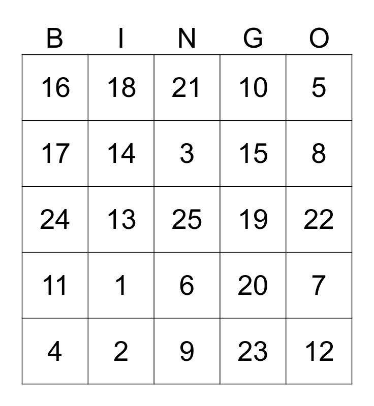 This bingo card has a free space and 24 words: 1, 2, 3, 4, 5, 16, 17, 18, 19, 6, 15, 24, 20, 7, 14, 23, 22, 21, 8, 13, 12, 11, 10 and 9.