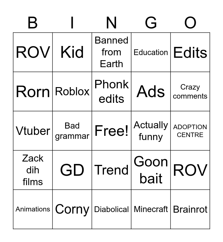 This bingo card has a free space and 24 words: GD, Corny, Phonk edits, Animations, Edits, ROV, Rorn, Kid, Actually funny, Trend, Ads, Vtuber, Goon bait, ROV, Roblox, Minecraft, ADOPTION CENTRE, Banned from Earth, Crazy comments, Bad grammar, Brainrot, Zack dih films, Education and Diabolical.