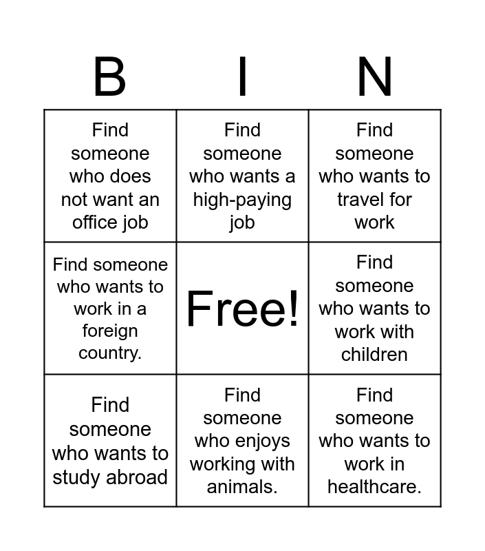 This bingo card has a free space and 8 words: Find someone who wants to work with children, Find someone who wants to travel for work, Find someone who wants a high-paying job, Find someone who wants to study abroad, Find someone who does not want an office job, Find someone who wants to work in healthcare., Find someone who wants to work in a foreign country. and Find someone who enjoys working with animals..