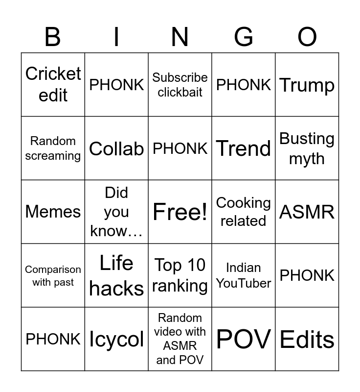This bingo card has a free space and 29 words: PHONK, AI, Did you know…, Sponsor, Cricket edit, Subscribe clickbait, Collab, Life hacks, Cooking related, Icycol, ASMR, Edits, Random video with ASMR and POV, POV, Busting myth, Social experiment, Top 10 ranking, Comparison with past, Trump, Memes, Indian YouTuber, Reacting, Trend, Random screaming, PHONK, PHONK, PHONK, PHONK and PHONK.