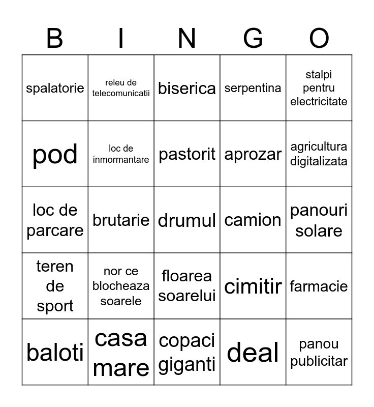 This bingo card has a free space and 30 words: casa mare, fum, brutarie, apa curgatoare, spalatorie, biserica, loc de inmormantare, floarea soarelui, camion, copaci giganti, panouri solare, panou publicitar, deal, stol de pasari, agricultura digitalizata, copacei mici, cimitir, teren de sport, nor ce blocheaza soarele, stalpi pentru electricitate, loc de parcare, ceata, releu de telecomunicatii, aprozar, pod, serpentina, farmacie, baloti, pastorit and gradinita/scoala.