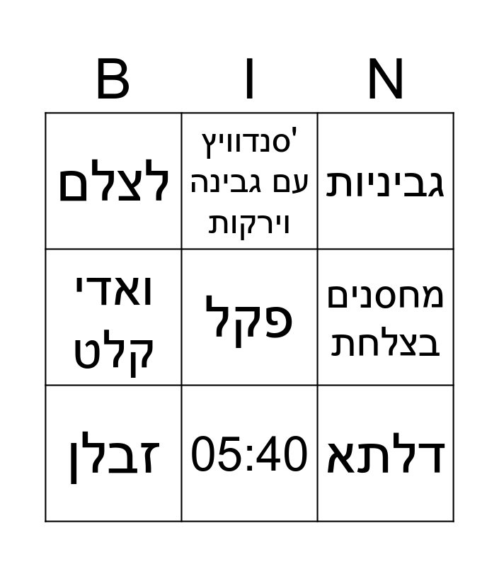 This bingo card has 13 words: ביטוח לאומי, שיריון, זבלן, סנדוויץ' עם גבינה וירקות, ואדי קלט, פקל, דלתא, גדי, 05:40, לצלם, מחסנים בצלחת, גביניות and קפה רותחחח.