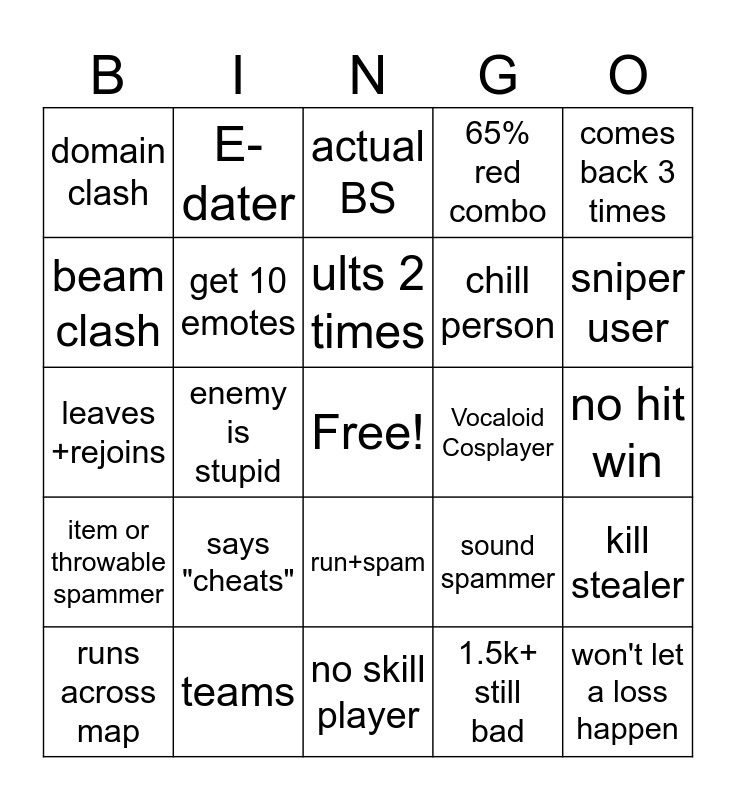 This bingo card has a free space and 24 words: says "cheats", teams, ults 2 times, runs across map, comes back 3 times, domain clash, beam clash, E-dater, Vocaloid Cosplayer, run+spam, chill person, leaves +rejoins, sound spammer, kill stealer, get 10 emotes, 1.5k+ still bad, no hit win, actual BS, sniper user, enemy is stupid, won't let a loss happen, item or throwable spammer, 65% red combo and no skill player.