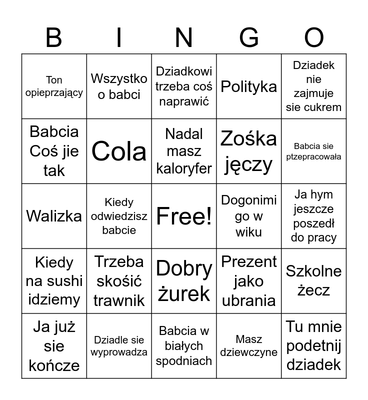This bingo card has a free space and 24 words: Ja już sie kończe, Trzeba skośić trawnik, Nadal masz kaloryfer, Masz dziewczyne, Dziadek nie zajmuje sie cukrem, Ton opieprzający, Wszystko o babci, Dziadkowi trzeba coś naprawić, Dogonimi go w wiku, Ja hym jeszcze poszedł do pracy, Walizka, Cola, Prezent jako ubrania, Szkolne żecz, Babcia Coś jie tak, Dziadle sie wyprowadza, Babcia w białych spodniach, Polityka, Babcia sie ptzepracowała, Kiedy na sushi idziemy, Kiedy odwiedzisz babcie, Dobry żurek, Zośka jęczy and Tu mnie podetnij dziadek.