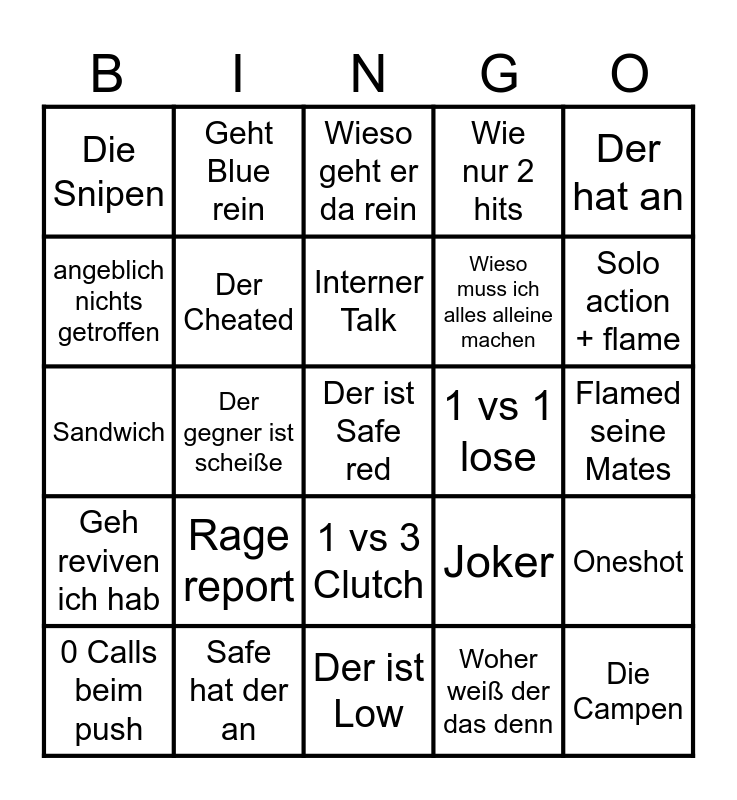 This bingo card has 25 words: Rage report, Der ist Low, Interner Talk, 0 Calls beim push, Der hat an, Die Snipen, angeblich nichts getroffen, Geht Blue rein, 1 vs 1 lose, 1 vs 3 Clutch, Wieso muss ich alles alleine machen, Sandwich, Joker, Oneshot, Der Cheated, Die Campen, Flamed seine Mates, Wieso geht er da rein, Solo action + flame, Der gegner ist scheiße, Der ist Safe red, Safe hat der an, Geh reviven ich hab, Wie nur 2 hits and Woher weiß der das denn.