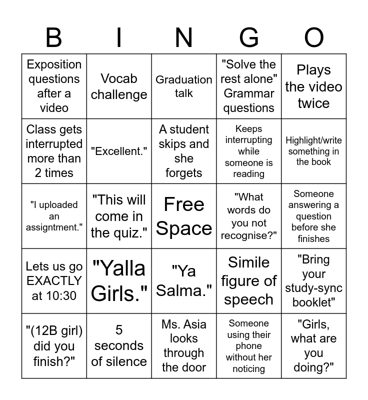 This bingo card has a free space and 24 words: "Yalla Girls.", 5 seconds of silence, A student skips and she forgets, "(12B girl) did you finish?", Plays the video twice, Exposition questions after a video, Class gets interrupted more than 2 times, Vocab challenge, "What words do you not recognise?", "Ya Salma.", Keeps interrupting while someone is reading, "I uploaded an assigntment.", Simile figure of speech, "Bring your study-sync booklet", "Excellent.", Someone using their phone without her noticing, Someone answering a question before she finishes, Graduation talk, Highlight/write something in the book, "This will come in the quiz.", "Girls, what are you doing?", Lets us go EXACTLY at 10:30, "Solve the rest alone" Grammar questions and Ms. Asia looks through the door.