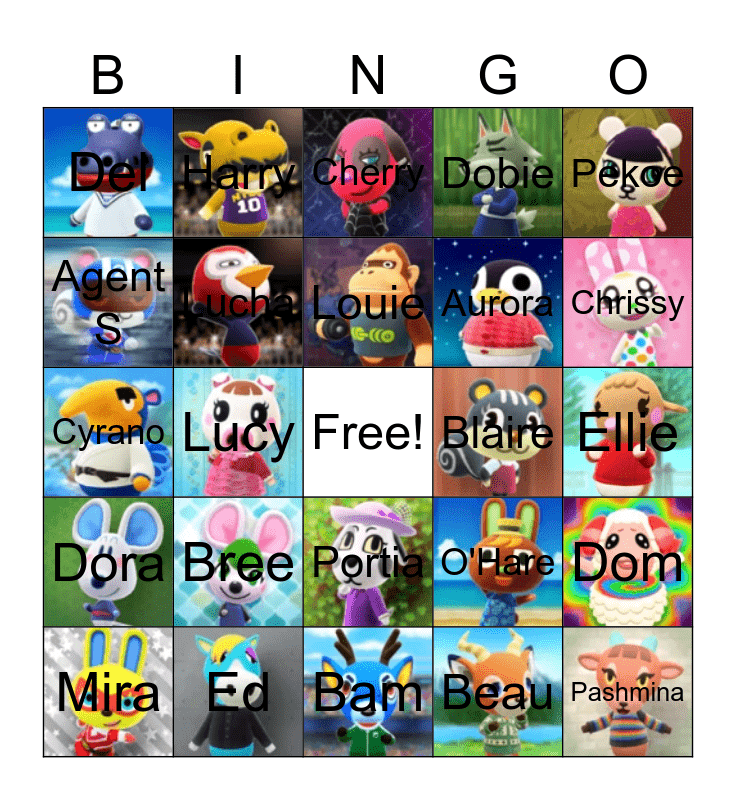 This bingo card has 299 images, a free space and 299 words: Ace, Admiral, Agent S, Agnes, Al, Alfonso, Alice, Alli, Amelia, Anabelle, Anchovy, Angus, Anicotti, Ankha, Annalisa, Annalise, Antonio, Apollo, Apple, Astrid, Audie, Aurora, Ava, Avery, Axel, Azalea, Baabara, Bam, Bangle, Barold, Bea, Beardo, Beau, Becky, Bella, Benedict, Benjamin, Bertha, Bettina, Bianca, Biff, Big Top, Bill, Billy, Biskit, Bitty, Blaire, Blanche, Bluebear, Bob, Bonbon, Bones, Boomer, Boone, Boots, Boris, Boyd, Bree, Broccolo, Broffina, Bruce, Bubbles, Buck, Bud, Bunnie, Butch, Buzz, Cally, Camofrog, Canberra, Candi, Carmen, Caroline, Carrie, Cashmere, Celia, Cephalobot, Cesar, Chabwick, Chadder, Portia, Charlise, Poppy, Cheri, Cherry, Chester, Chevre, Chief, Chops, Chow, Chrissy, Claude, Claudia, Clay, Cleo, Clyde, Coach, Cobb, Coco, Cole, Colton, Cookie, Cousteau, Cranston, Croque, Cube, Curlos, Curly, Curt, Cyd, Cyrano, Daisy, Deena, Deirdre, Del, Deli, Derwin, Diana, Diva, Dizzy, Dobie, Doc, Dom, Dora, Dotty, Drago, Drake, Drift, Ed, Egbert, Elise, Ellie, Elmer, Eloise, Elvis, Erik, Prince, Eugene, Eunice, Faith, Fang, Fauna, Felicity, Filbert, Flip, Flo, Flora, Flurry, Francine, Frank, Freckles, Frett, Freya, Friga, Frita, Frobert, Fuchsia, Gabi, Gala, Gaston, Gayle, Genji, Gigi, Gladys, Gloria, Goldie, Gonzo, Goose, Graham, Greta, Grizzly, Groucho, Gruff, Gwen, Hamlet, Hamphrey, Hans, Harry, Hazel, Henry, Hippeux, Hopkins, Hopper, Hornsby, Huck, Hugh, Iggly, Ike, Ione, Jacob, Jacques, Jambette, Jay, Jeremiah, Jitters, Joey, Judy, Julia, Julian, June, Kabuki, Katt, Keaton, Ken, Ketchup, Kevin, Kid Cat, Kidd, Kiki, Kitt, Kitty, Klaus, Knox, Kody, Kyle, Leonardo, Leopold, Lily, Limberg, Lionel, Lobo, Lolly, Lopez, Louie, Lucha, Lucky, Lucy, Lyman, Mac, Maddie, Maelle, Maggie, Mallary, Maple, Marcel, Marcie, Margie, Marina, Marlo, Marshal, Puck, Mathilda, Megan, Melba, Merengue, Merry, Midge, Mint, Mira, Miranda, Mitzi, Moe, Molly, Monique, Monty, Moose, Mott, Muffy, Murphy, Nan, Nana, Naomi, Nate, Nibbles, Norma, O'Hare, Octavian, Olaf, Olive, Olivia, Opal, Ozzie, Pancetti, Pango, Paolo, Papi, Pashmina, Pate, Patty, Paula, Peaches, Peanut, Pecan, Peck, Peewee, Peggy, Pekoe, Penelope, Petri, Phil, Phoebe, Pierce, Pietro, Pinky, Piper, Pippy, Plucky, Pompom and Poncho.