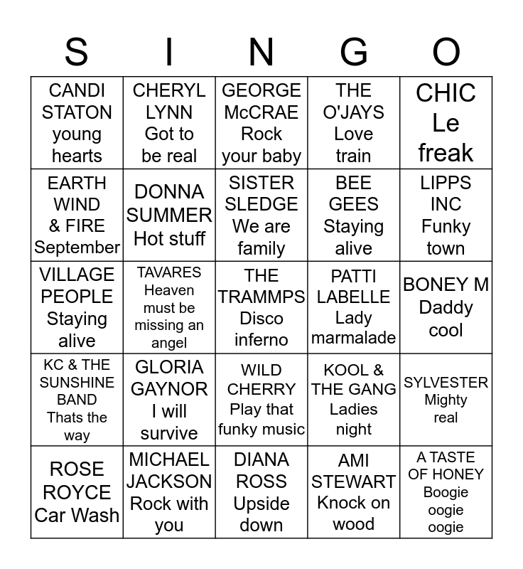 This bingo card has a free space and 24 words: GLORIA GAYNOR I will survive, MICHAEL JACKSON Rock with you, SISTER SLEDGE We are family, ROSE ROYCE Car Wash, CHIC Le freak, CANDI STATON young hearts, EARTH WIND & FIRE September, CHERYL LYNN Got to be real, PATTI LABELLE Lady marmalade, WILD CHERRY Play that funky music, BEE GEES Staying alive, VILLAGE PEOPLE Staying alive, KOOL & THE GANG Ladies night, SYLVESTER Mighty real, DONNA SUMMER Hot stuff, AMI STEWART Knock on wood, BONEY M Daddy cool, GEORGE McCRAE Rock your baby, LIPPS INC Funky town, TAVARES Heaven must be missing an angel, A TASTE OF HONEY Boogie oogie oogie, KC & THE SUNSHINE BAND Thats the way, THE O'JAYS Love train and DIANA ROSS Upside down.