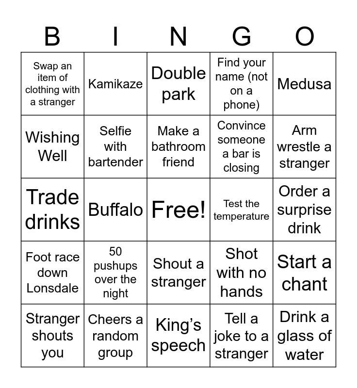 This bingo card has a free space and 39 words: Mississippi, Split the G (must be judged), Win a game of pool, Selfie with bartender, Stranger shouts you, Shout a stranger, Make a bathroom friend, Safe and Sound (check in on Facebook w/ photo), Medusa, Foot race down Lonsdale, Buffalo, Find your name (not on a phone), Drink a glass of water, Order a surprise drink, Test the temperature, 50 pushups over the night, Get a stranger’s number, Swap an item of clothing with a stranger, Reenact the Barnaby Joyce, Shot with no hands, Wishing Well, King’s speech, Convince someone a bar is closing, Arm wrestle a stranger, Shoey, Lawn Bowls, Roll a die – finish drink in that many sips, Trickshot, Win in Fingers, Kamikaze, Most different drinks, Perform a magic trick, Double park, Cheers a random group, Tell a joke to a stranger, 5 minute accent, Start a chant, Trade drinks and Complete a dare.