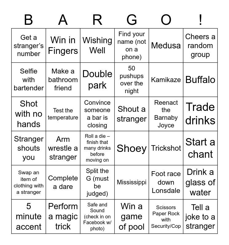 This bingo card has 36 words: Mississippi, Split the G (must be judged), Win a game of pool, Selfie with bartender, Stranger shouts you, Shout a stranger, Make a bathroom friend, Safe and Sound (check in on Facebook w/ photo), Medusa, Foot race down Lonsdale, Buffalo, Find your name (not on a phone), Drink a glass of water, Test the temperature, 50 pushups over the night, Get a stranger’s number, Swap an item of clothing with a stranger, Reenact the Barnaby Joyce, Shot with no hands, Wishing Well, Convince someone a bar is closing, Arm wrestle a stranger, Shoey, Roll a die – finish that many drinks before moving on, Trickshot, Win in Fingers, Kamikaze, Perform a magic trick, Double park, Cheers a random group, Tell a joke to a stranger, 5 minute accent, Start a chant, Trade drinks, Complete a dare and Scissors Paper Rock with Security/Cop.