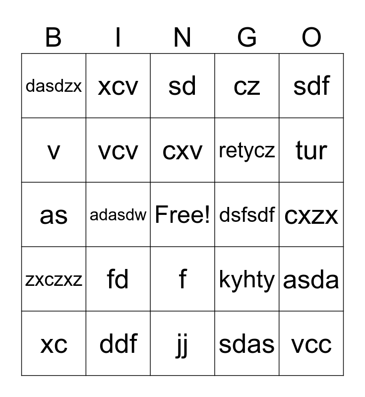 This bingo card has a free space and 24 words: fd, ddf, cxv, xc, sdf, dasdzx, v, xcv, dsfsdf, f, retycz, as, kyhty, asda, vcv, sdas, cxzx, sd, tur, adasdw, vcc, zxczxz, cz and jj.
