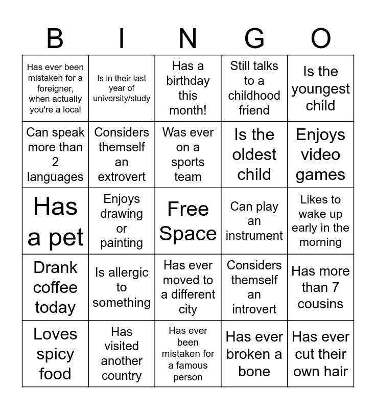This bingo card has a free space and 24 words: Is allergic to something, Has visited another country, Was ever on a sports team, Loves spicy food, Is the youngest child, Has ever been mistaken for a foreigner, when actually you're a local, Can speak more than 2 languages, Is in their last year of university/study, Can play an instrument, Has ever moved to a different city, Is the oldest child, Has a pet, Considers themself an introvert, Has more than 7 cousins, Considers themself an extrovert, Has ever broken a bone, Likes to wake up early in the morning, Has a birthday this month!, Enjoys video games, Enjoys drawing or painting, Has ever cut their own hair, Drank coffee today, Still talks to a childhood friend and Has ever been mistaken for a famous person.
