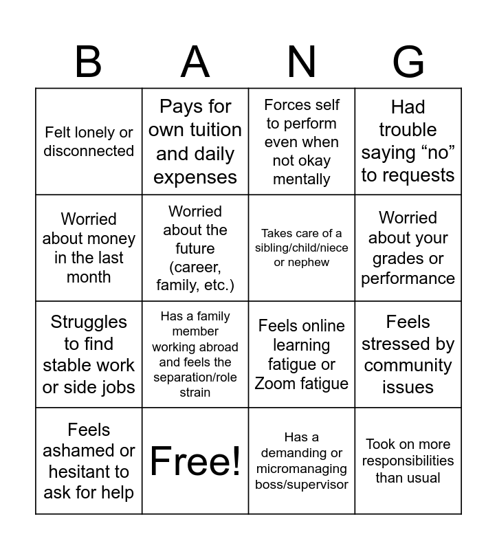 This bingo card has 24 words: Pulled an all-nighter or slept <5 hours this week, Argued with a family member or partner recently, Worried about your grades or performance, Experienced a health scare (your own or loved one’s), Worried about money in the last month, Felt lonely or disconnected, Worried about the future (career, family, etc.), Pays for own tuition and daily expenses, Free!, Arrived late or missed class because of a work shift, Struggles to find stable work or side jobs, Feels online learning fatigue or Zoom fatigue, Feels pressure from family to succeed quickly, Spends a long time commuting, Takes care of a sibling/child/niece or nephew, moving homes or adjusting to a new environment pressure to succeed, Has a demanding or micromanaging boss/supervisor, Forces self to perform even when not okay mentally, Has a family member working abroad and feels the separation/role strain, Feels stressed by community issues, Feels ashamed or hesitant to ask for help, Took on more responsibilities than usual, Had trouble saying “no” to requests and Still does house chores even when tired from work and school.