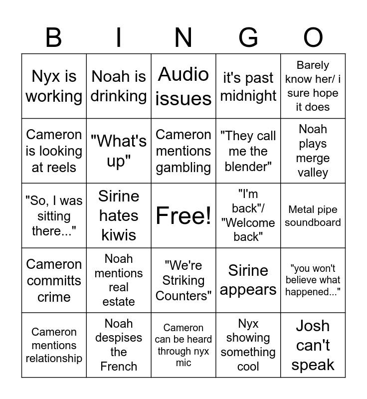 This bingo card has a free space and 24 words: Noah mentions real estate, Noah despises the French, Cameron mentions gambling, Cameron mentions relationship, Barely know her/ i sure hope it does, Nyx is working, Cameron is looking at reels, Noah is drinking, "I'm back"/ "Welcome back", "We're Striking Counters", "They call me the blender", "So, I was sitting there...", Sirine appears, "you won't believe what happened...", "What's up", Nyx showing something cool, Metal pipe soundboard, Audio issues, Noah plays merge valley, Sirine hates kiwis, Josh can't speak, Cameron committs crime, it's past midnight and Cameron can be heard through nyx mic.