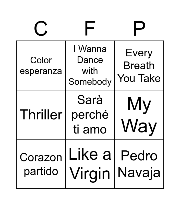 This bingo card has 9 words: Corazon partido, Every Breath You Take, I Wanna Dance with Somebody, Thriller, Color esperanza, My Way, Sarà perché ti amo, Pedro Navaja and Like a Virgin.