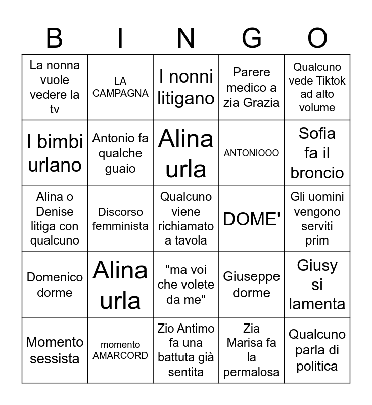 This bingo card has a free space and 24 words: Alina urla, momento AMARCORD, Alina urla, Momento sessista, Qualcuno vede Tiktok ad alto volume, La nonna vuole vedere la tv, I bimbi urlano, LA CAMPAGNA, DOME', "ma voi che volete da me", ANTONIOOO, Alina o Denise litiga con qualcuno, Giuseppe dorme, Giusy si lamenta, Antonio fa qualche guaio, Zia Marisa fa la permalosa, Gli uomini vengono serviti prim, I nonni litigano, Sofia fa il broncio, Discorso femminista, Qualcuno parla di politica, Domenico dorme, Parere medico a zia Grazia and Zio Antimo fa una battuta già sentita.
